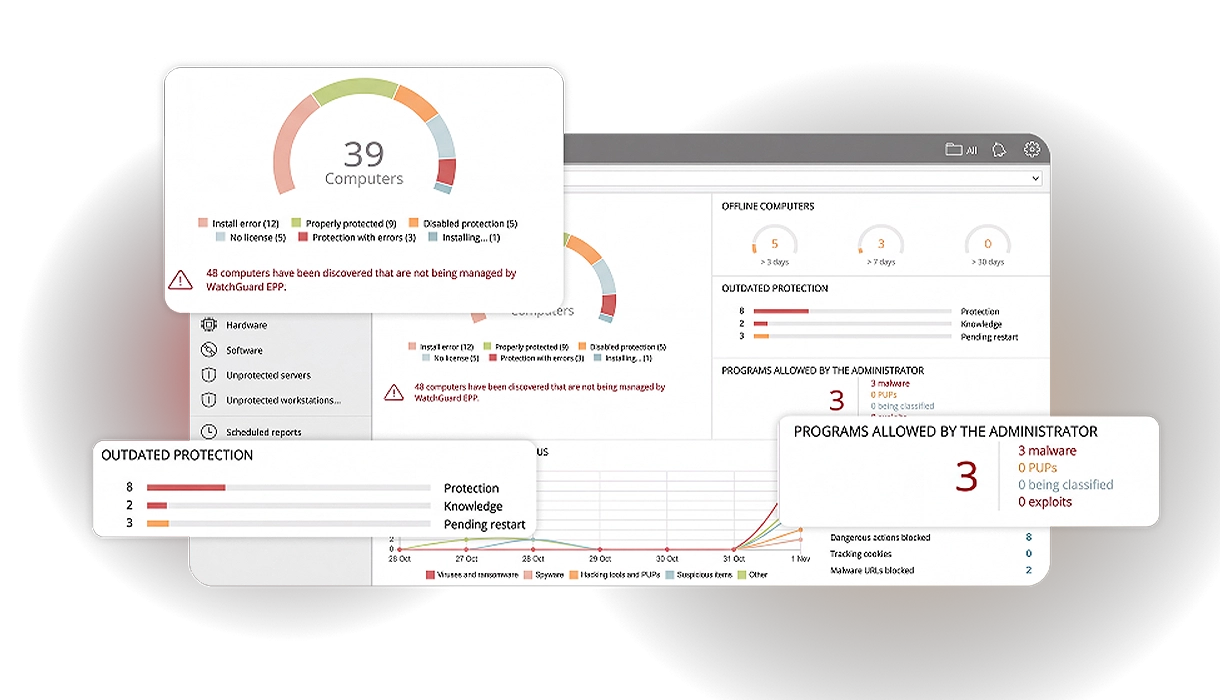 Detailed, real-time security monitoring is delivered via comprehensive dashboards and easy-to-interpret graphs. Reports are automatically generated and delivered on protection status, detections and improper use of devices.